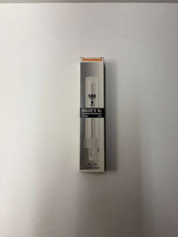 Sylvania Twin Tube Dulux Compact Fluorescent  Part #: CF9DS/827 Base: G23 Wattage: 9w Lumens: 580L Temperature: 2700K Length: 6.5"